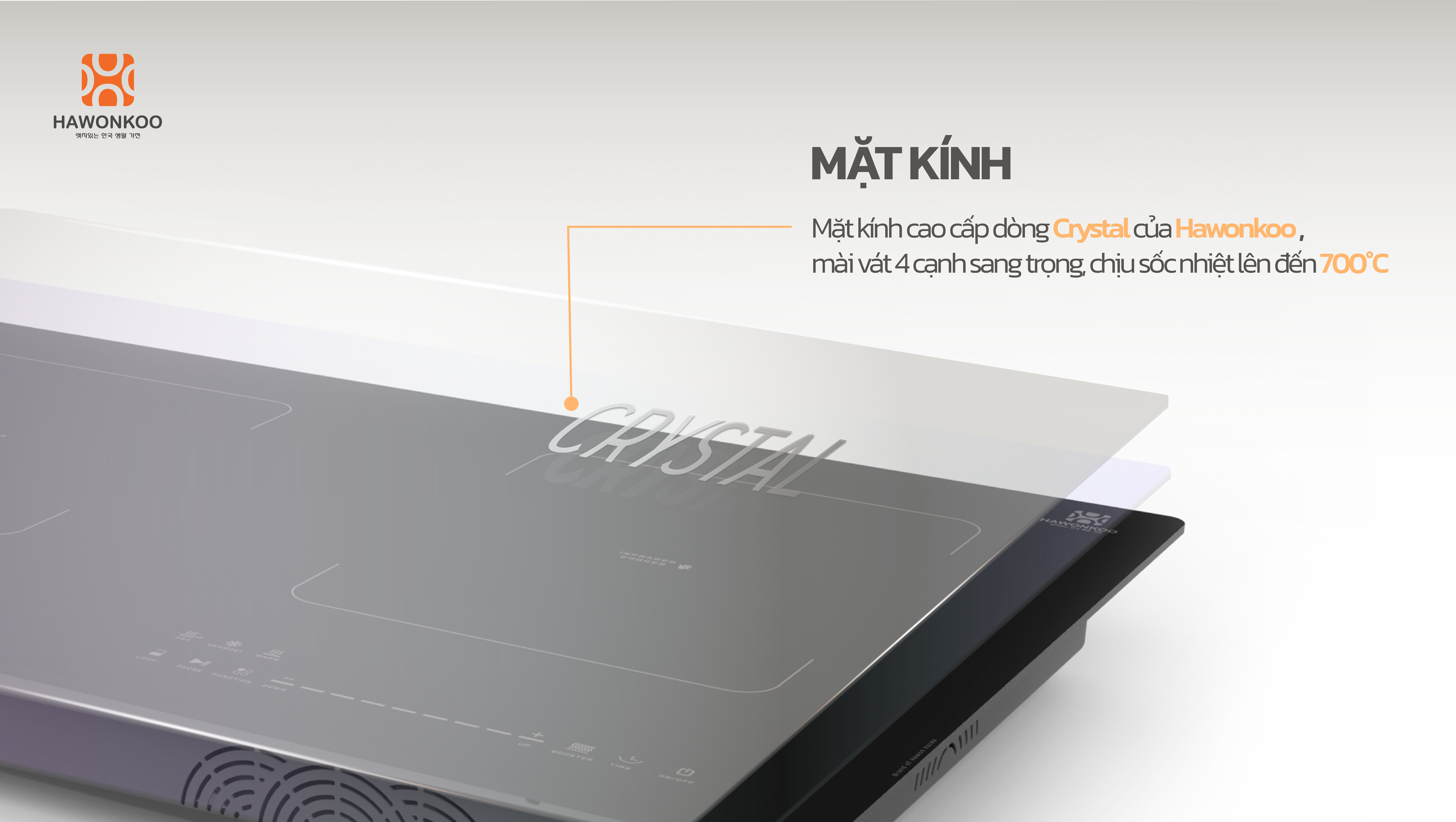 Bếp sử dụng mặt kính cao cấp dòng Crystal của Hawonkoo, nổi bật với độ cứng vượt trội, chống va đập và hạn chế trầy xước tối đa. Kính có khả năng chịu sốc nhiệt lên đến 700°C, giãn nở nhiệt gần như bằng không, đảm bảo ổn định và an toàn tuyệt đối trong suốt quá trình nấu nướng. Bề mặt kính được tối ưu truyền nhiệt, giúp gia nhiệt nhanh, đều, mang đến trải nghiệm nấu ăn mượt mà và tinh tế.
